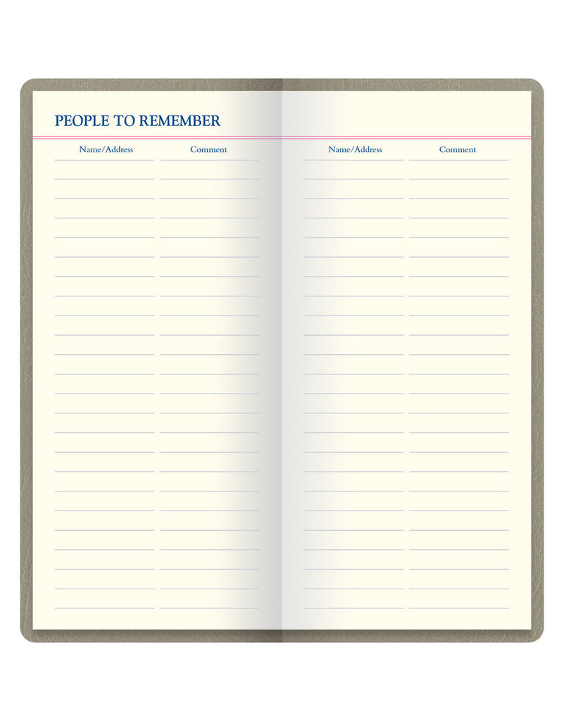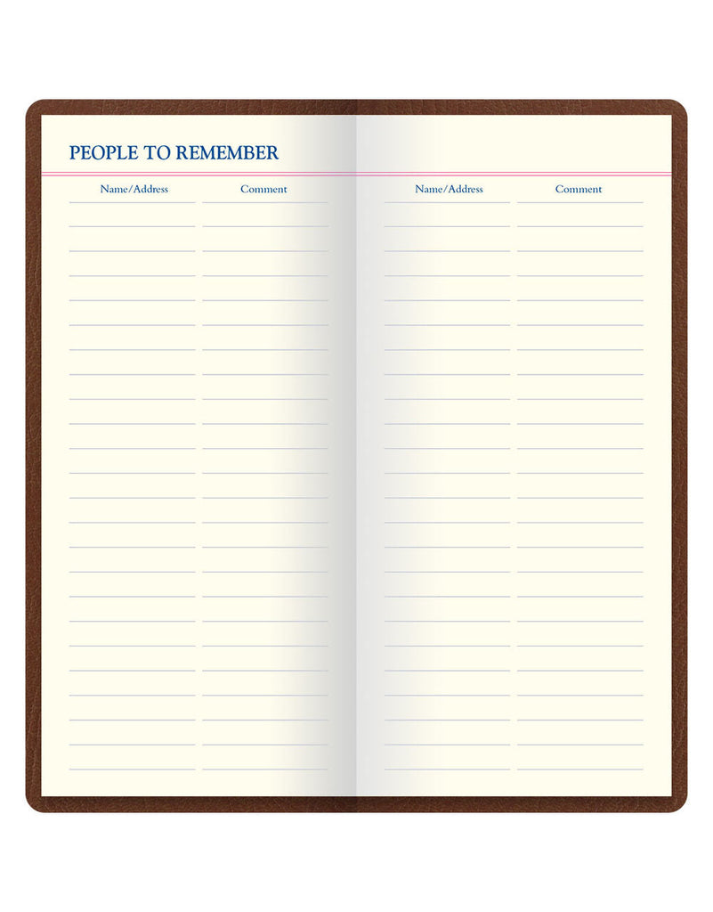 Leather-look Slim Pocket Travel Journal for the intrepid traveller, featuring 160 pages of cream paper. Contents include a world time zone map, city information and more. Includes a bespoke ballpoint pen with refillable blue ink, which is held in the spine.